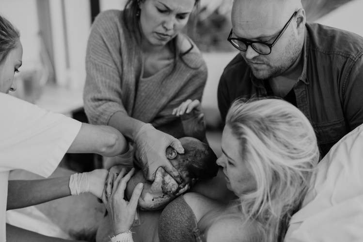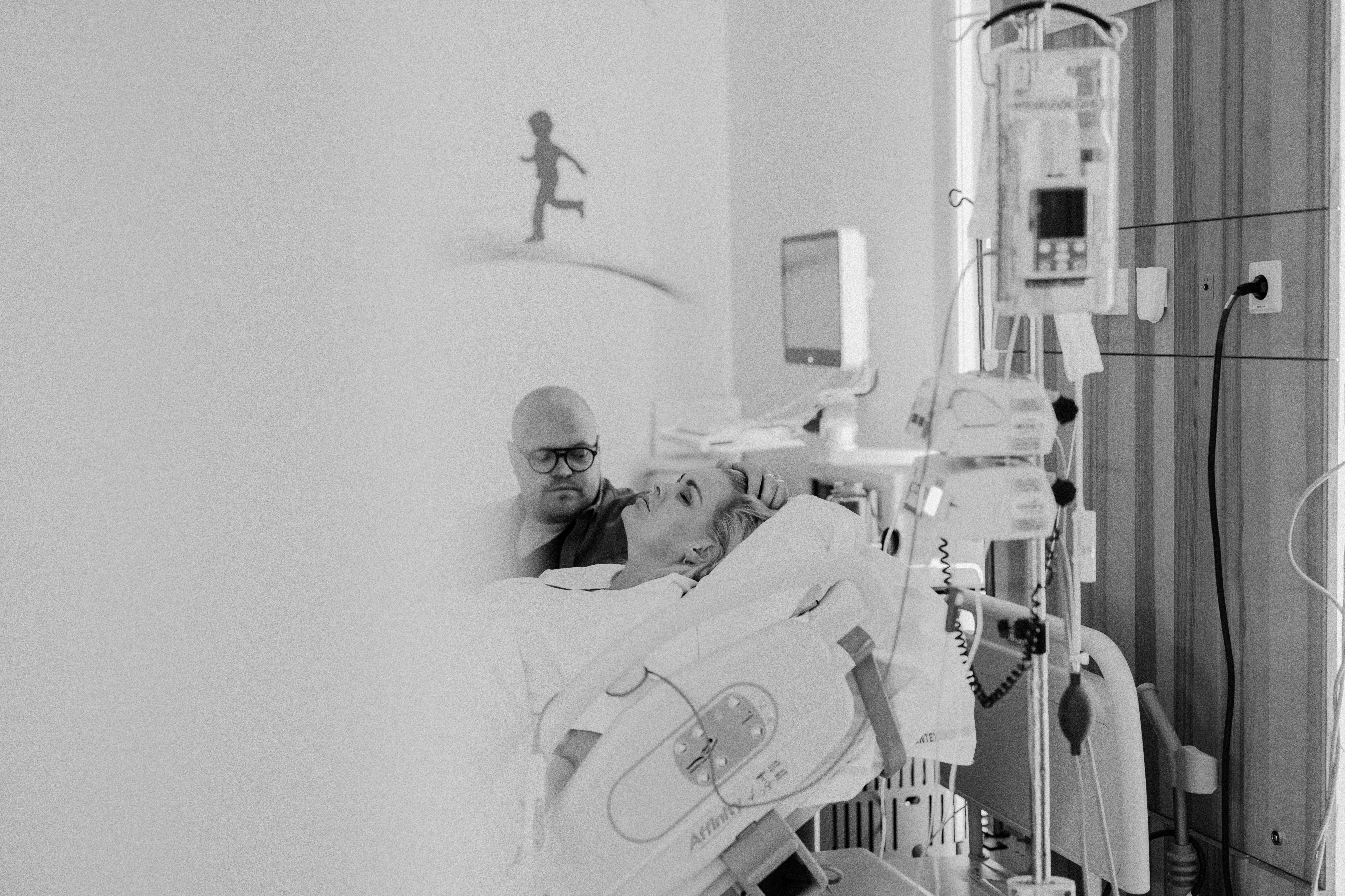 De volgende ochtend bleek de ontsluiting ook nog niet zo ver gevorderd te zijn als we dachten. Na de middag begonnen de eerste weeën en kwam binnen een paar minuten de anesthesist. Ze stond al klaar om zo snel mogelijk een ruggenprik te geven. Ik zag het, met al deze emoties niet zitten om naast het verlies ook nog zonder pijnstilling dit werk te moeten verzetten. Hoewel een ruggenprik zetten ook niet zaligmakend was. Ik vond het doodeng. Charlotte kwam binnen… Haar kleine buikje verhuld onderaar h wijde trui. We waren nog even.. heel even samen zwanger.. Wat had het anders moeten zijn. Ik had Charlotte gevraagd foto’s te maken van de bevalling. (Zoals ook de andere bevallingen vastgelegd waren) Pittig, want ook voor haar zo confronterend met een kleintje in haar buik.