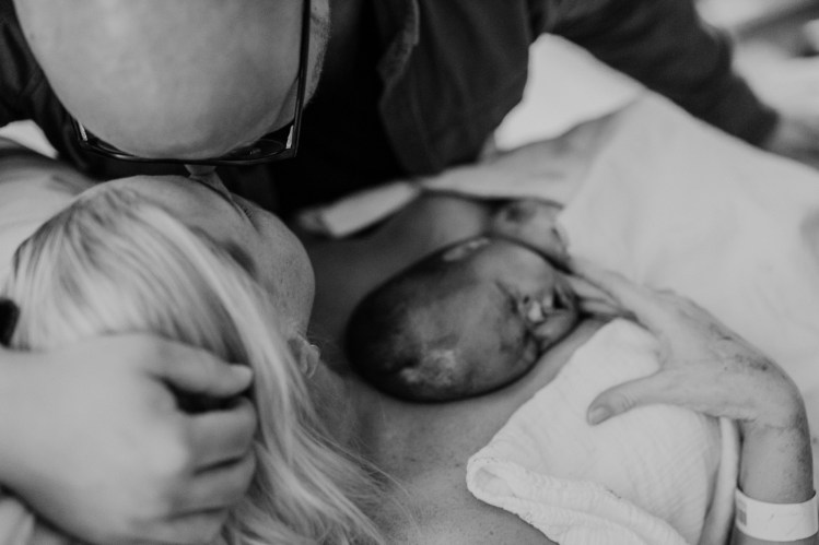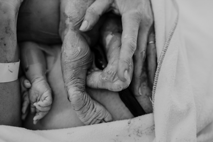 Door het lachen was ik blijkbaar zo ontspannen dat de weeën opeens wel erg snel na elkaar kwamen waarbij ik aan mijn rechterkant veel pijn had terwijl mijn linkerkant compleet verdoofd was. Al snel hield ik het niet meer uit en ook met het bedienen van het pompje van de epiduraal gebeurde maar weinig.. Esther wilde de anesthesist gaan halen maar al binnen 10 minuten ervoer ik dat ik moest persen… Terwijl de kamer volliep met mensen kreeg ik echt paniek… Amélie zou ter wereld komen en ze zou stil zijn, ik wist niet meer waar ik het zoeken moest… Ik vroeg Chrisje om niet meer de kamer uit te vluchten maar te blijven. Ik was zo bang. Maar al gauw probeerde ik me te focussen.. probeerde ik haar te begeleiden met m’n handen en welkom te heten en kwam ze in alle rust bij ons. Op m’n borst…