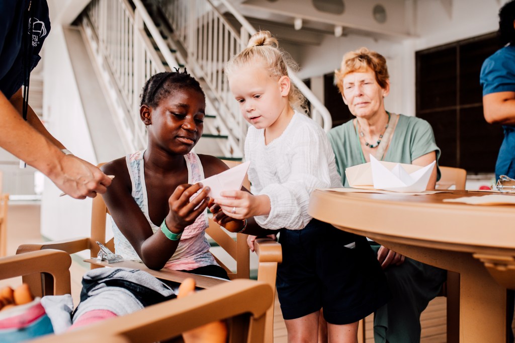 Mijn naam is Rose, ik ben negen jaar en woon aan boord van de Global Mercy. Ik geniet van het leven aan boord en vind het heel leuk om in community te leven. Ik zit in 4th grade in een klas met 6 meiden en 2 jongens. Ik krijg Bible, Social Studies, math, arts, PE. Alles in het Engels. Na school heb ik vaak nog runningclub, dansen, voetbal. Ik blijf het liefst aan boord, buiten het schip is er veel armoede en is heftig.